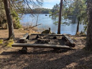 Grillplats med bänkar vid Övre Glotterns strand med ett naturligt vindskydd under en stor sten.
