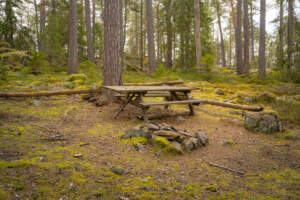 Grillplats längs leden genom Hinnerstorp naturreservat, det finns fler bord nära grillplatsen.