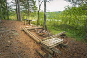 3 km rundslinga genom de kuperade tallskogarna med badplats och vindskydd vid sjöstranden.
