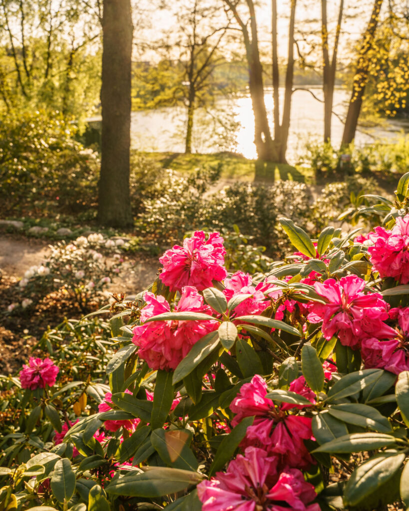 Rhododendrondalen ligger längs Motala ström rätt nära fiket Färgargården. Här hittar du ett antal olika rhododendronsorter som blommar i omgångar.
