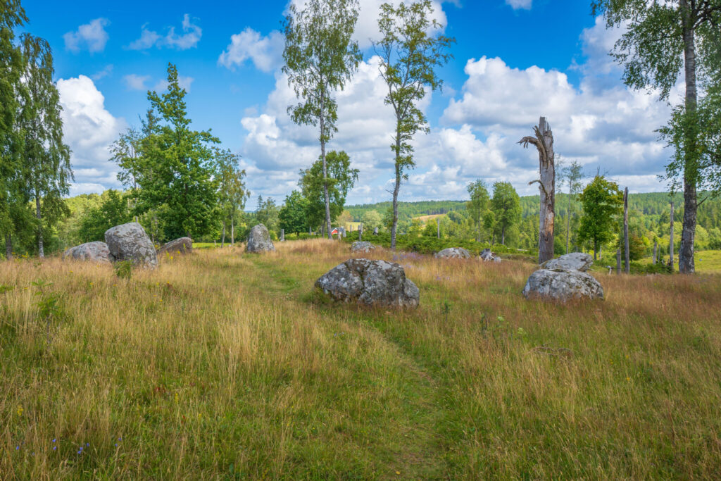 Ättehögskullen är ett unikt gravfält från tiden kring folkvandringstiden, med sin domarring och de stora, resta stenarna. Platsen upptäcktes redan 1843. Idag passerar bilarna förbi på väg mellan Färgelanda och Uddevalla – varför inte svänga av vägen och titta närmare på de gamla gravarna?