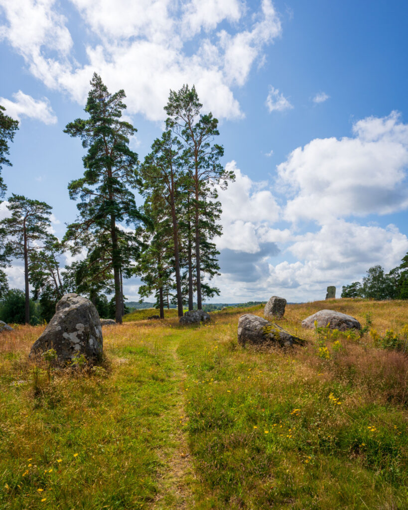 Underbar utsiktsplats över de restaurerade betesmarkerna runt Ödeborg och med tre mäktiga resta stenar, en domarring och gravplats.