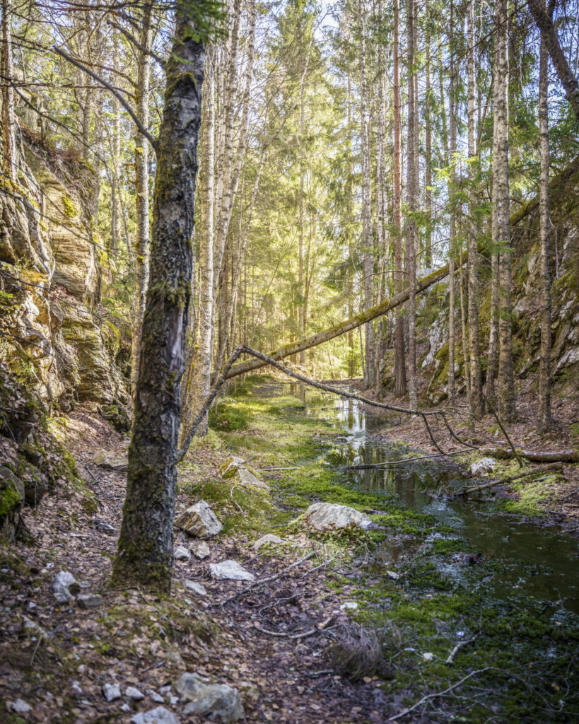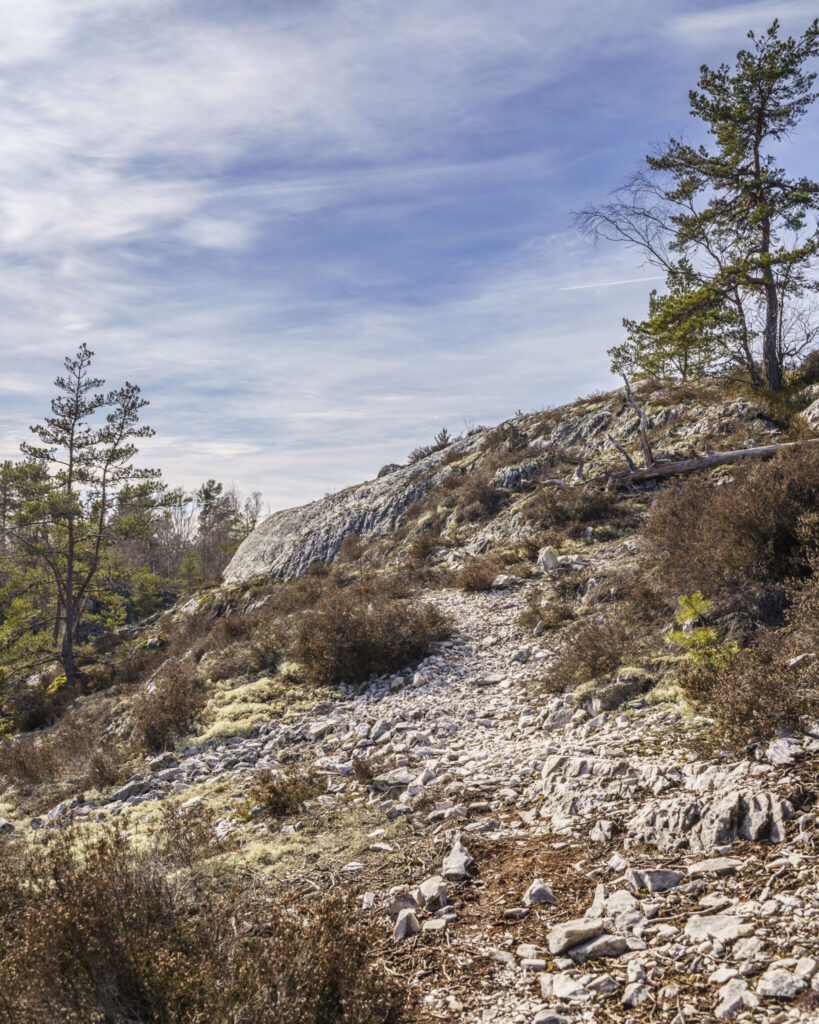 Längs leden finns det massor av annat spännande att se, inte minst för att det en gång bröts kvartsit som här är glimrande vit och lyser skimrande på berghällen.