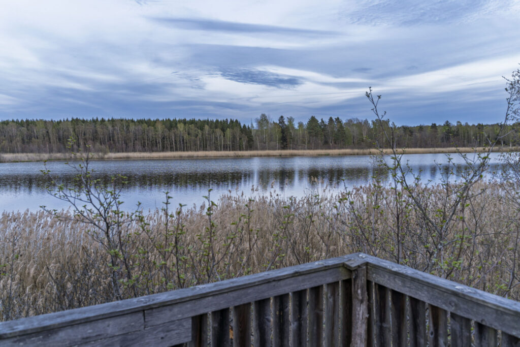 Fågeltorn som tar dig över vasskanten som växer runt viken. Det är någon kilometer promenad till närmaste parkering vid infarten till Västanvik.