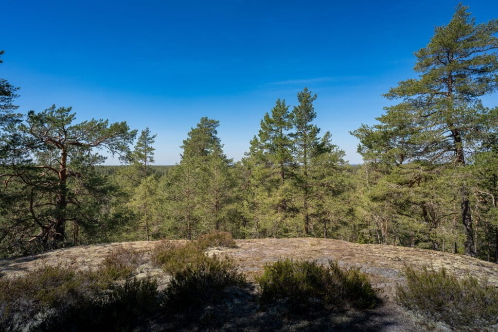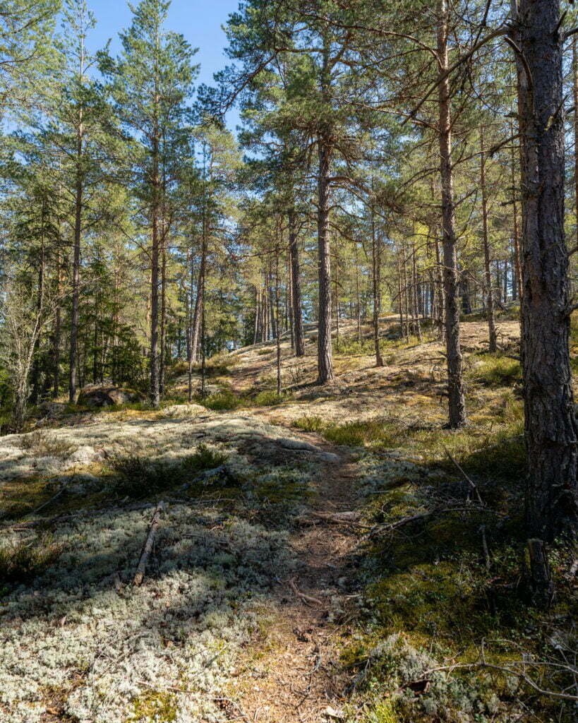 3 km rundslinga genom de kuperade tallskogarna med badplats och vindskydd vid sjöstranden.