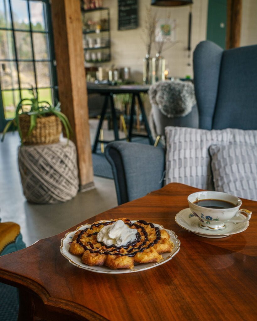 Vi tycker att det här ett riktigt mysigt stopp för en go-fika i trevlig gårdsmiljö. Den absolut bästa tiden att besöka är under våren när lammen börjat komma och fåren är i ladan bredvid caféet. I caféet serveras oftast 7-sorters kakor eller nygräddade våfflor. Om du är hungrigare så går det att förbeställa mer matiga alternativ.