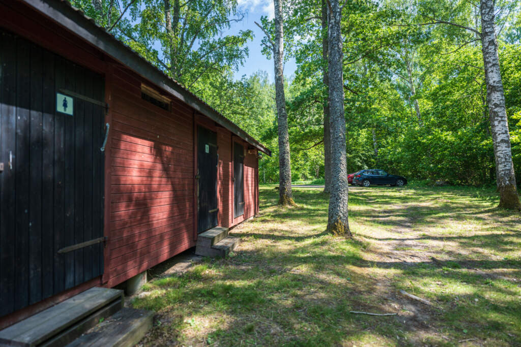 Sista metrarna ner till badstranden går längs en smal skogsväg och framme vid parkeringen finns det dass och omklädningsrums.